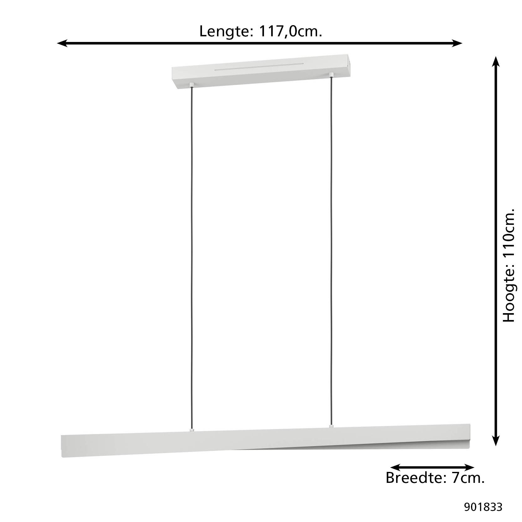 De Bolognano-Z hanglamp heeft een lengte van 117 cm, breedte van 7 cm en een verstelbare hoogte van max. 110 cm. De Bolognano-Z lampenserie bestaat naast de hanglamp ook uit een plafondlamp en een bijpassend vloerlamp en tafellamp.