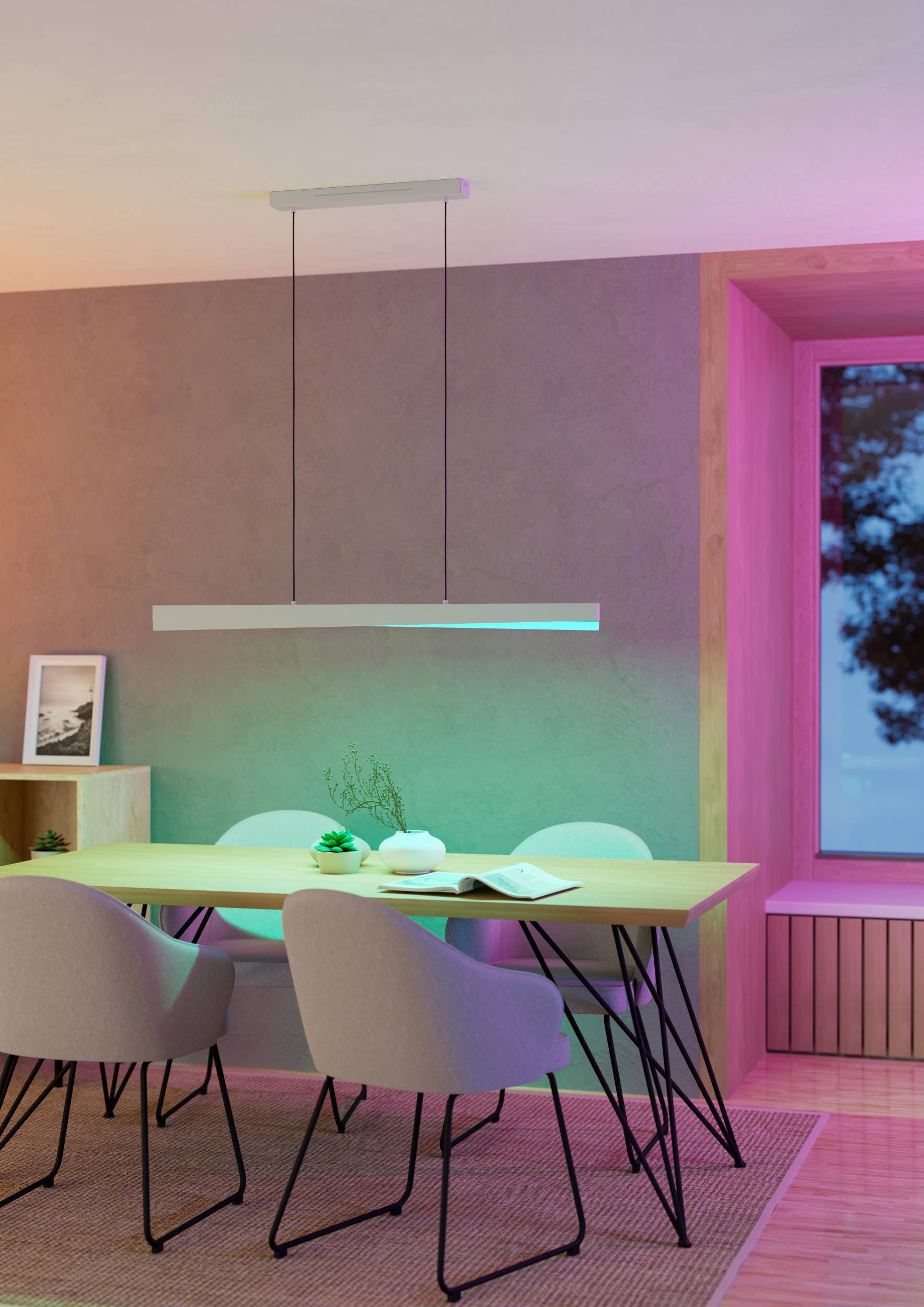 De Bolognano-Z hanglamp wordt geleverd inclusief LED van 19 Watt, met een totaal lichtopbrengst van 2300 Lumen. Als onderdeel van het Eglo Connect.Z Smart-Home-systeem biedt hanglamp flexibele lichtregeling in warmwitte tot koelwitte tinten en in RGB-kleuren (2700-6500K)– ideaal voor functionele verlichting en sfeervolle accenten.