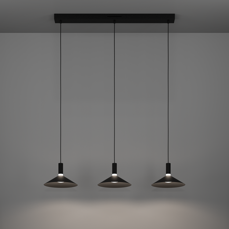De hanglamp Conomavilla-Z 3-lichts van Eglo Connect.z brengt moderne elegantie en slimme verlichting samen in een minimalistisch ontwerp. De strakke, matzwarte kap met geïntegreerde lichtbron (elk van 7,5 Watt) straalt rust en stijl uit, terwijl het licht subtiel over het oppervlak verspreid wordt — perfect voor boven een eettafel, kookeiland of bar.