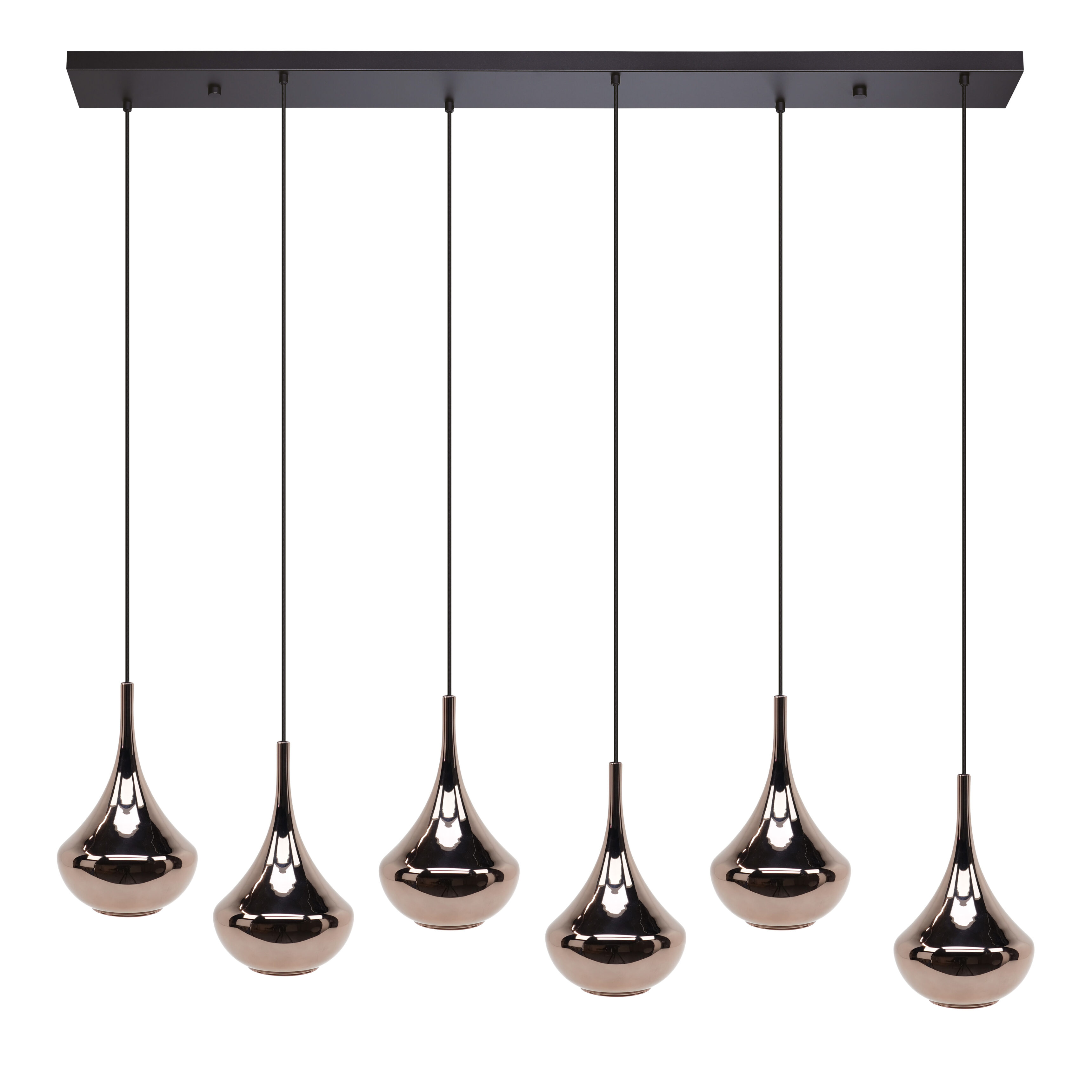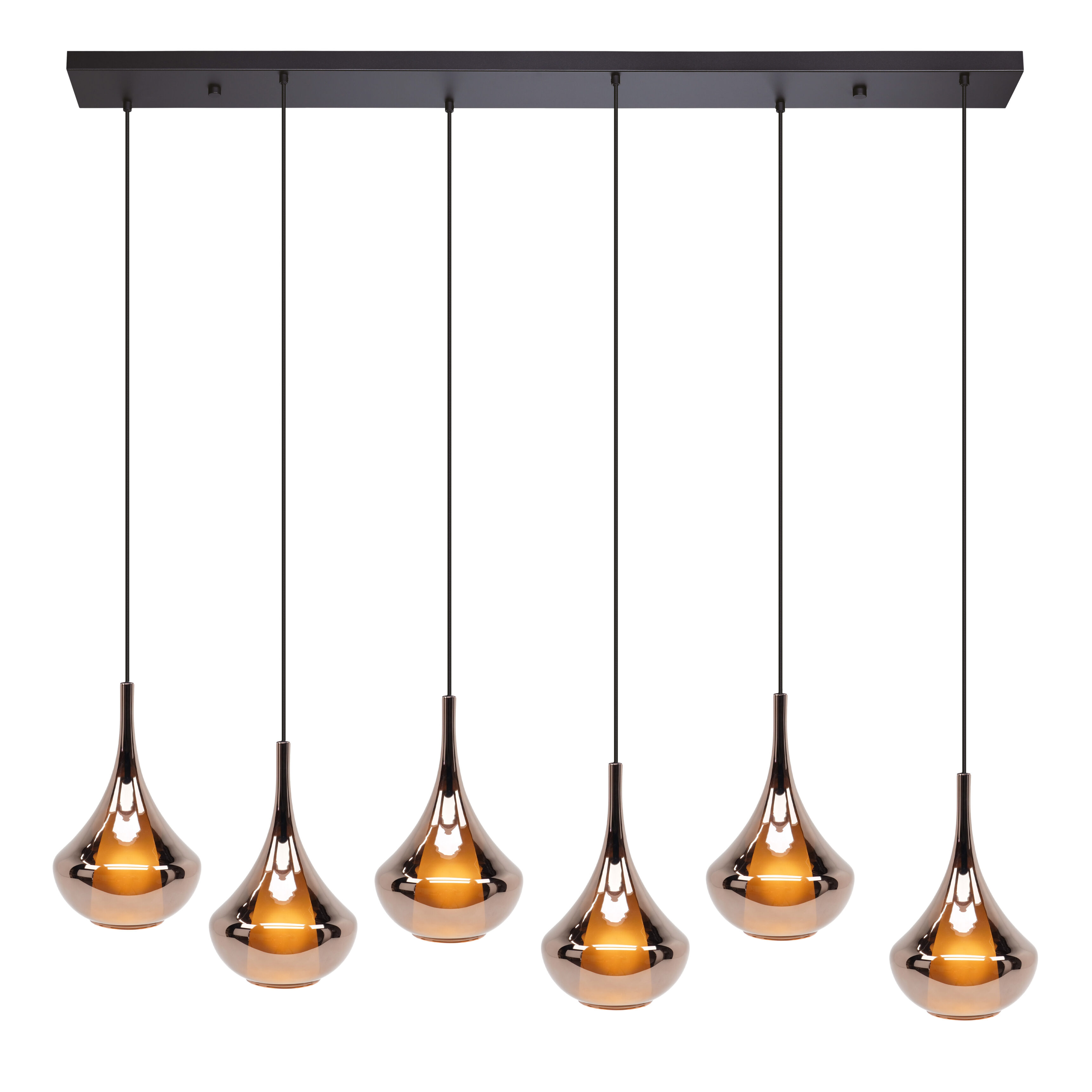 De Almoster 6-lichts hanglamp van Eglo Stars of Light is een indrukwekkende eyecatcher die elegantie en luxe samenbrengt. Het ontwerp, geïnspireerd op de sierlijke vorm van een waterdruppel, combineert twee glazen lagen tot één verfijnd geheel. Het buitenste glas, uitgevoerd in een spiegelende koperkleur, zorgt voor een moderne en chique uitstraling. Wanneer de lamp wordt ingeschakeld, onthult het opaalachtige binnenste glas zich en verspreidt het een zacht, verblindingsvrij licht. Dit creëert een warme en uitnodigende sfeer in de ruimte.