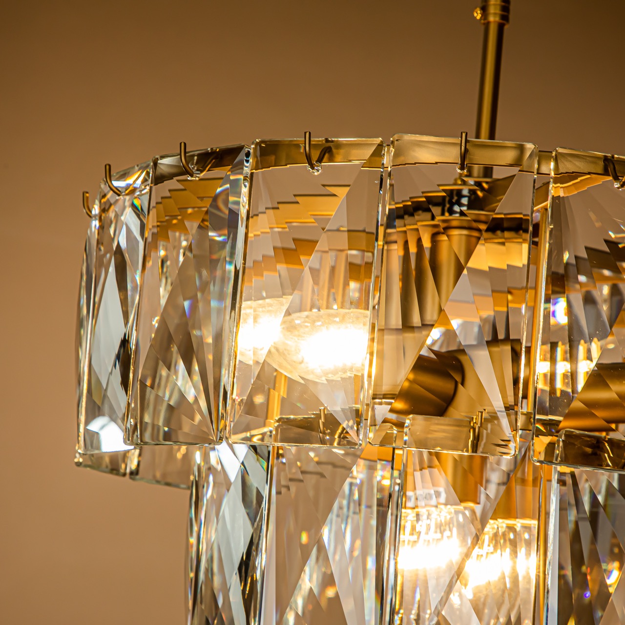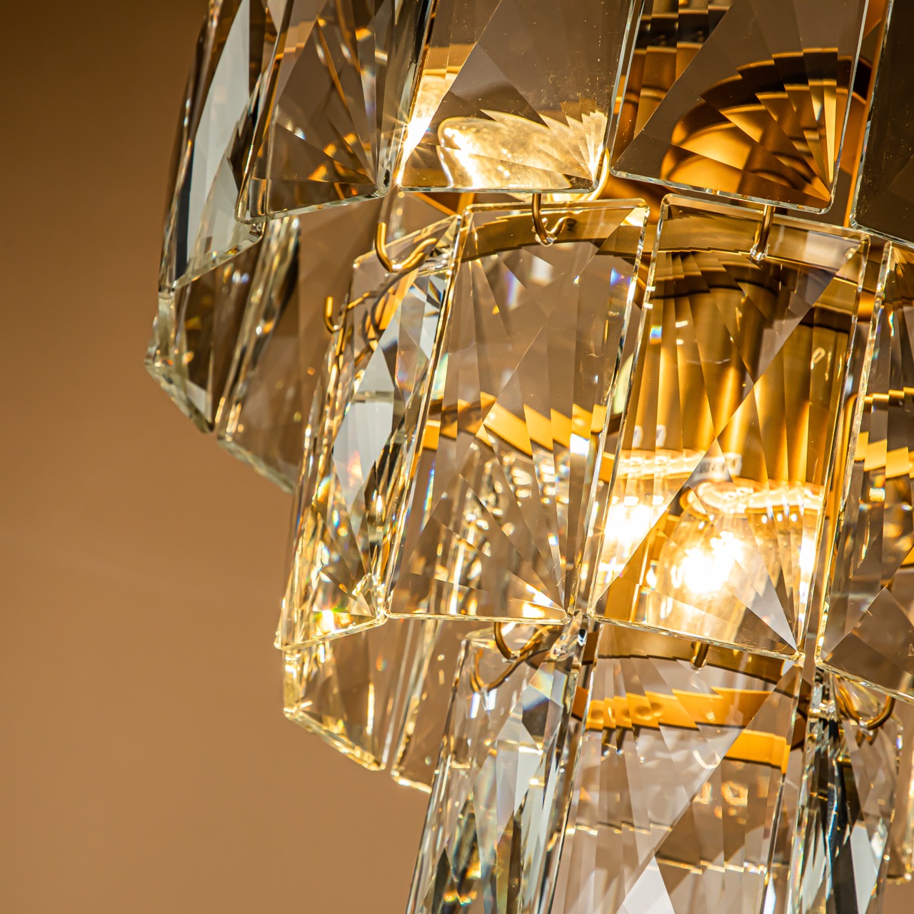 • Trapvormig ontwerp: De lagen kristallen hangen in aflopende ringen, wat een kenmerkende vorm is van klassieke kroonluchters.