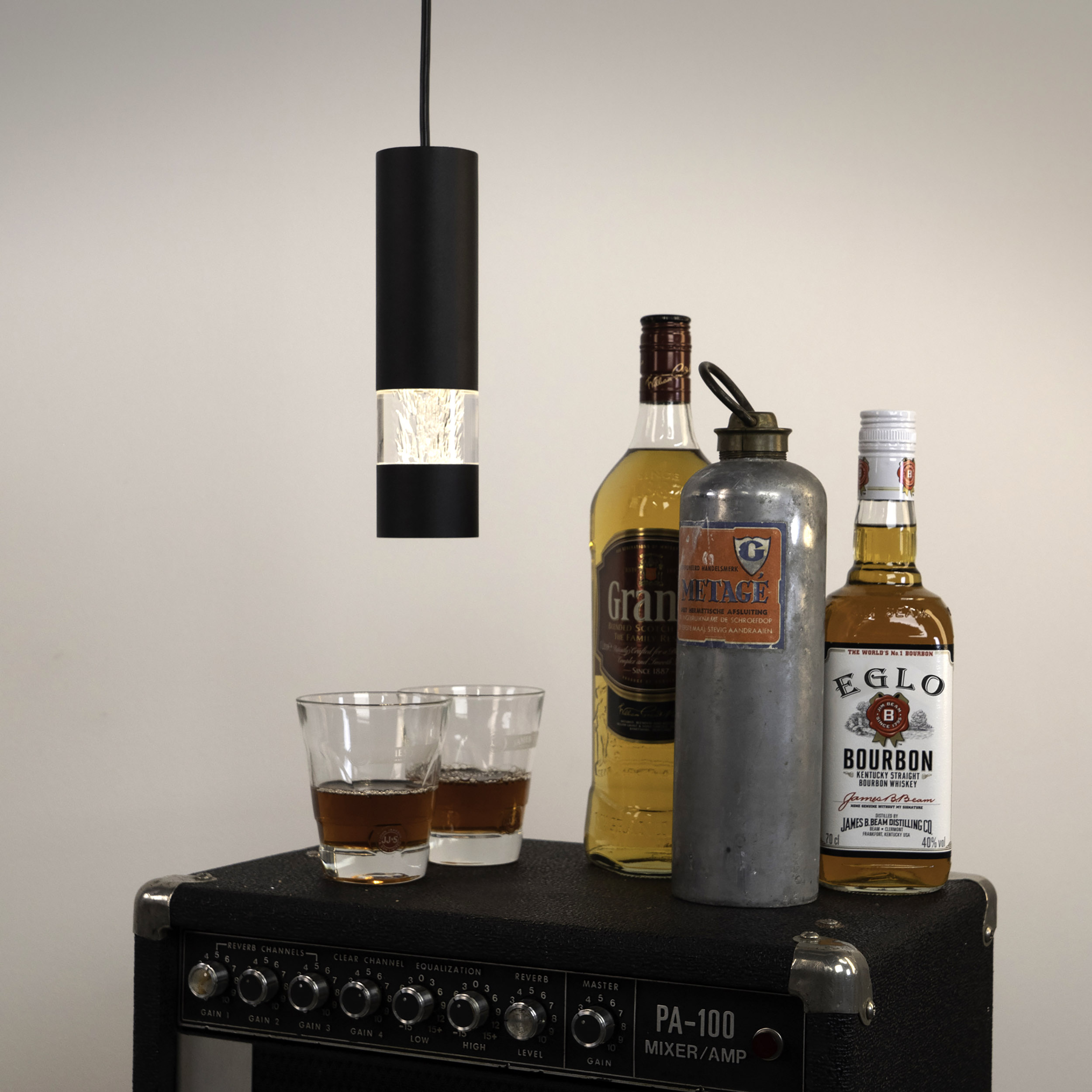 De 1-lichts hanglamp Bernabeta van Eglo STARS OF LIGHT heeft een zwarte cilindervorming pendellamp. In het middelste deel van de hanglamp bevindt zich een helder, kunststof element met gekristalliseerde luchtbelletjes, wat een onderscheidend lichteffect in de kamer creëert. Deze hanglamp is de perfecte finishing touch voor moderne en minimalistische interieurs en creëert unieke verlichting in de woonkamer of boven de tafel in de eetkamer.