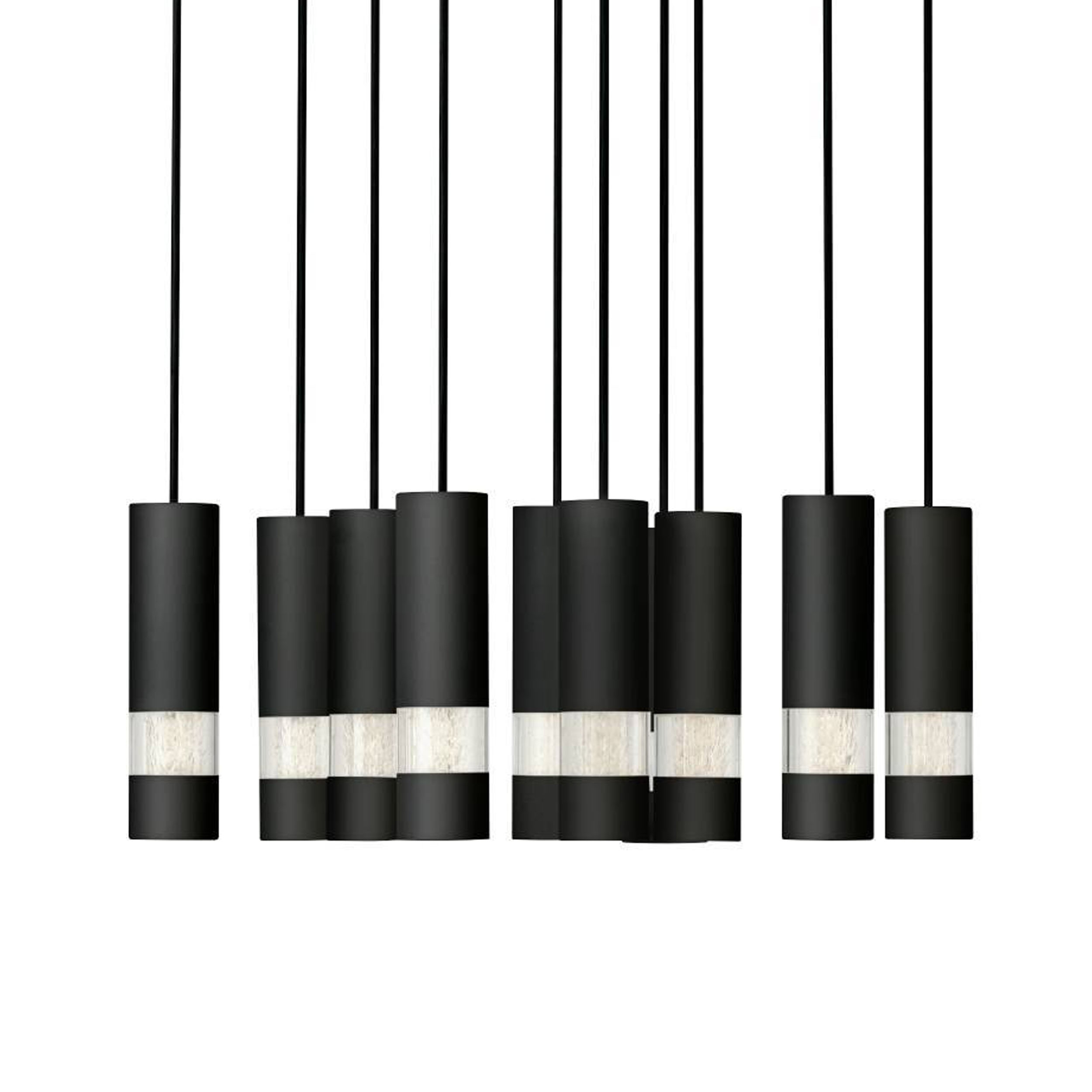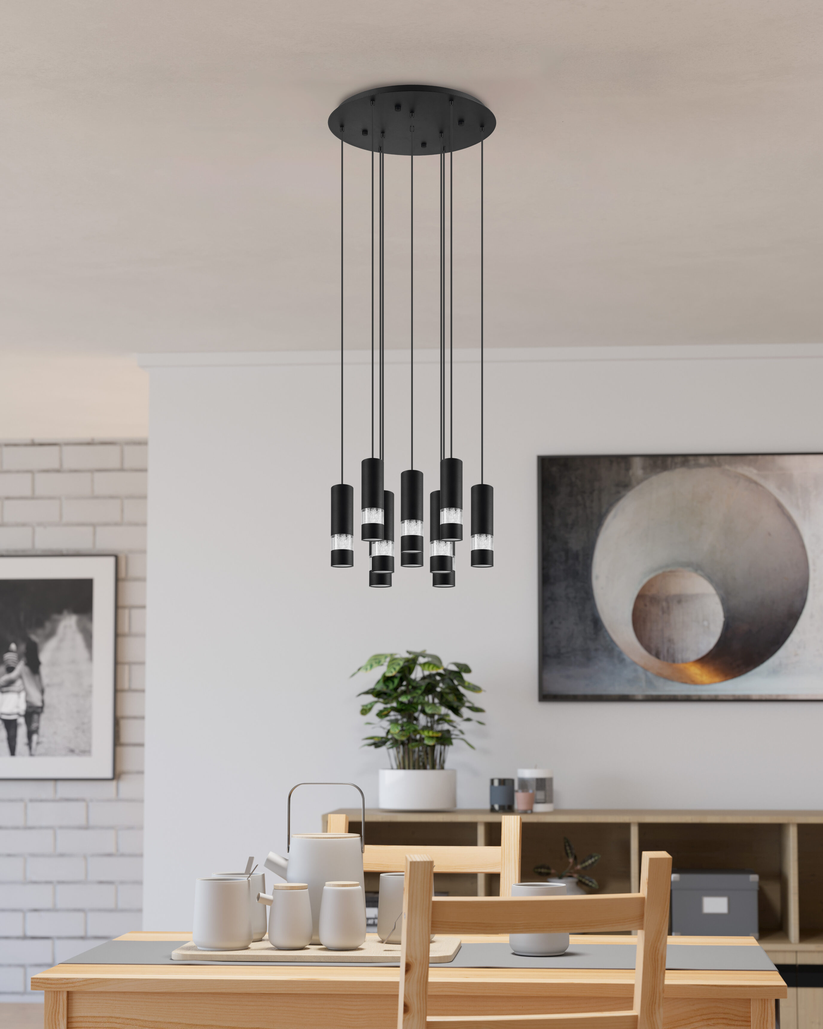 De 10-lichts hanglamp Bernabeta van Eglo STARS OF LIGHT heeft tien cilindervorming pendellampen en een ronde plafondplaat van zwart metaal. In het middelste deel van de pendels bevindt zich een helder, kunststof element met gekristalliseerde luchtbelletjes, wat een onderscheidend lichteffect in de kamer creëert. Deze hanglamp is de perfecte finishing touch voor moderne en minimalistische interieurs en creëert unieke verlichting in de woonkamer of boven de tafel in de eetkamer.