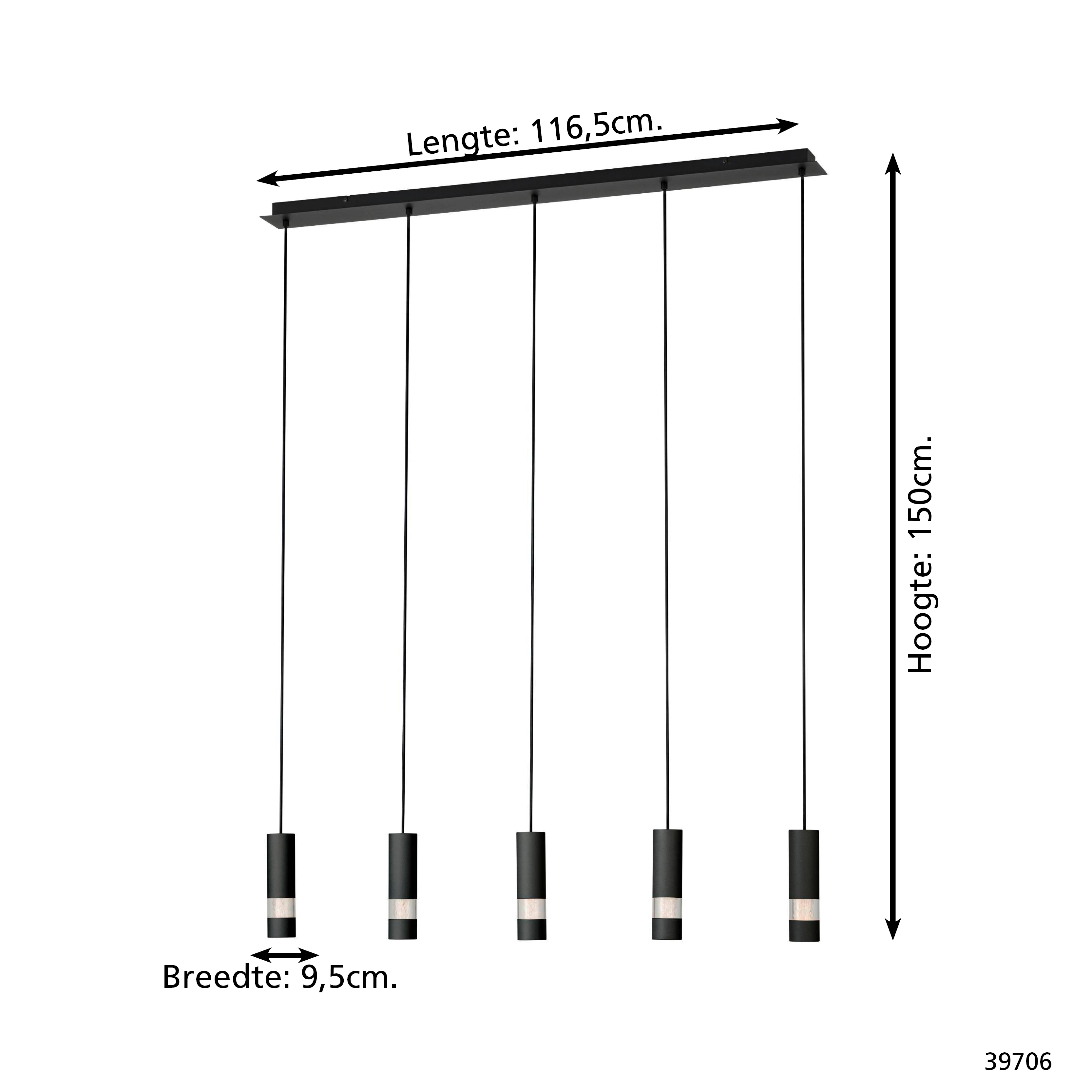 De 5-lichts hanglamp Bernabeta van Eglo STARS OF LIGHT heeft vijf zwarte cilindervorming pendellampen. In het middelste deel van de pendels bevindt zich een helder, kunststof element met gekristalliseerde luchtbelletjes, wat een onderscheidend lichteffect in de kamer creëert. Deze hanglamp is de perfecte finishing touch voor moderne en minimalistische interieurs en creëert unieke verlichting in de woonkamer of boven de tafel in de eetkamer.