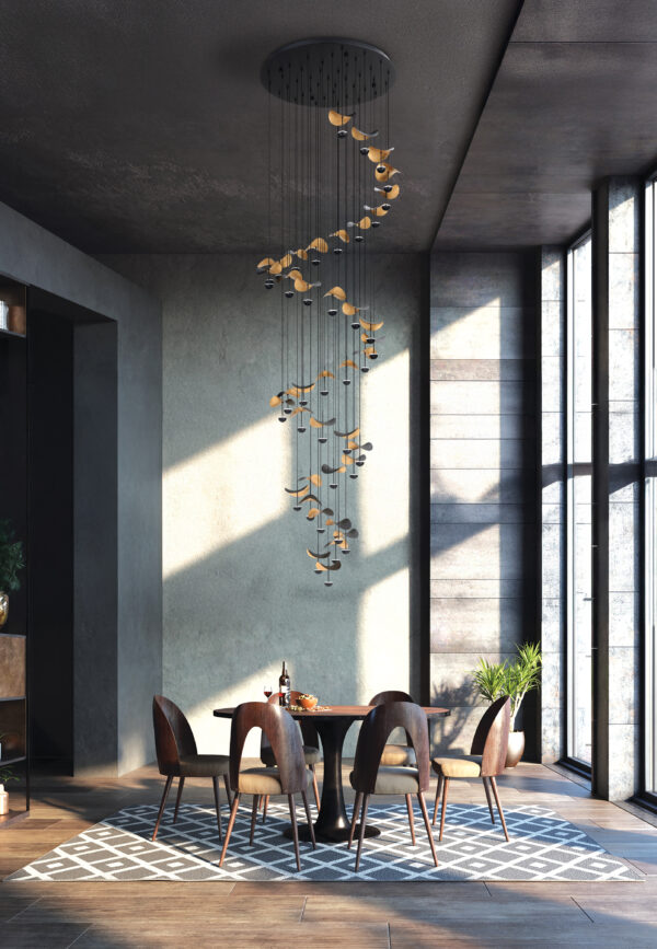 Deze speelse Dracera hanglamp van Eglo STARS OF LIGHT geeft een leuke sfeer aan elke ruimte. Een echte blikvanger! De hanglamp bestaat uit 10 LED lampen met hangende gouden blaadjes. De hanglamp is uitgevoerd in staal en afgewerkt in de kleur zwart met gouden details.