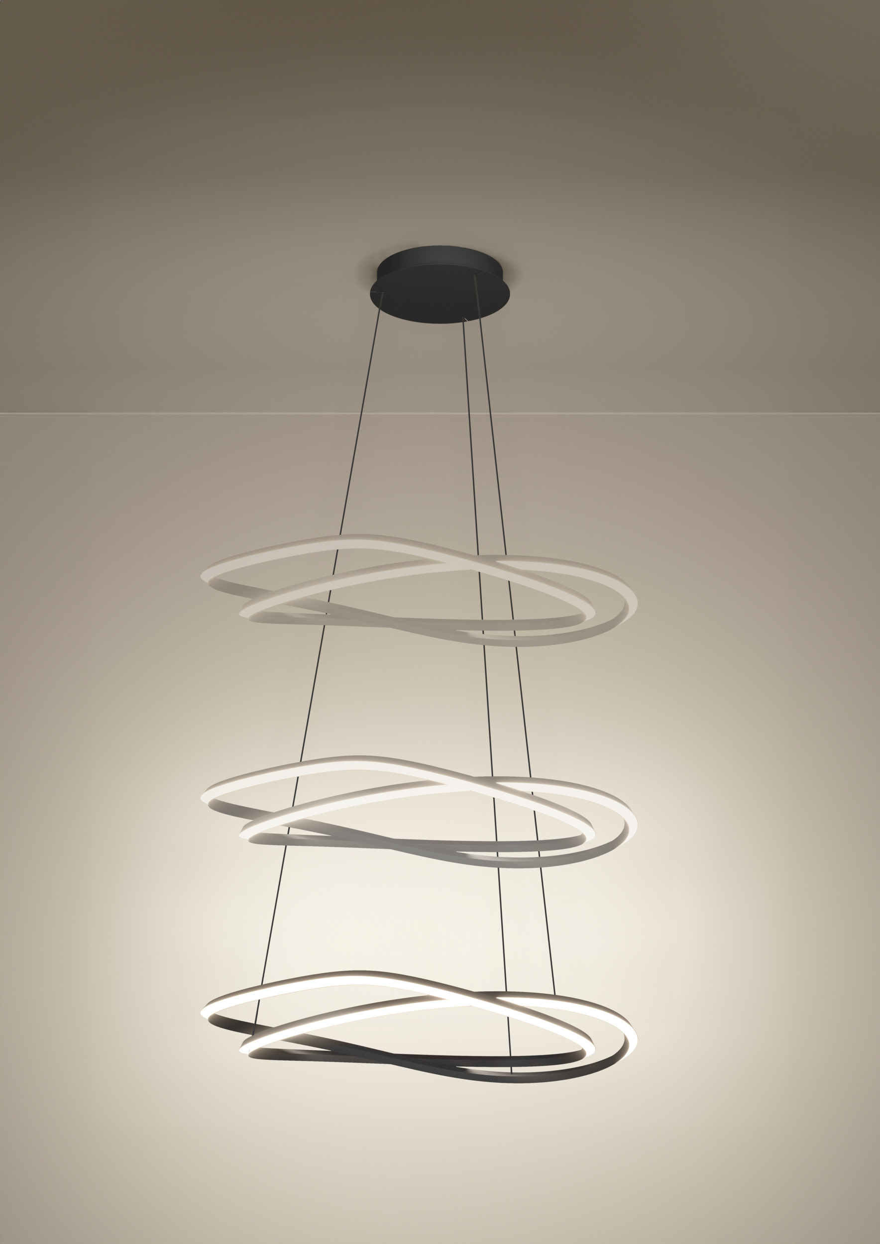 De hanglamp Guntin is met zijn organische gebogen vormen een stijlvolle blikvanger in een moderne woon- of eetkamer. De hanglamp is afgewerkt in een modern donkergrijze kleur. Het armatuur van staal vorm een dynamische lijn, die elegant wordt gedragen door vier fijne kabelophangingen.