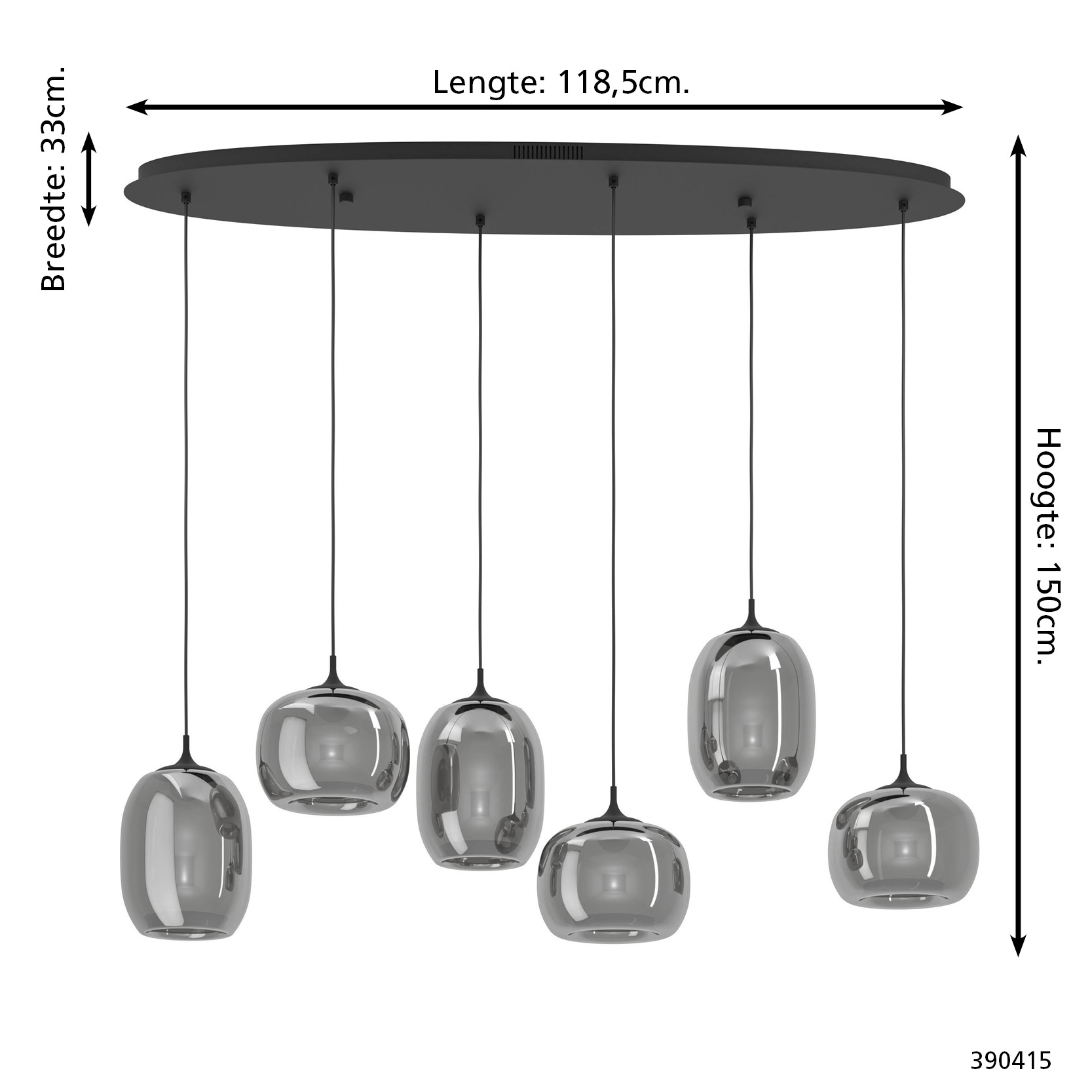 De lamp heeft een lengte van 118,5 cm, breedte van 33 cm en een verstelbare hoogte van maximaal 150 cm.