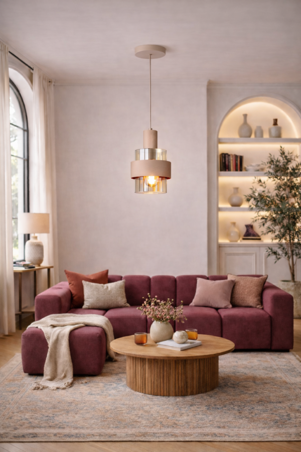 Het moderne ontwerp is vervaardigd uit hoogwaardig metaal in een zachte zandkleur, gecombineerd met glas in warme ambertinten. Deze combinatie zorgt voor een trendy uitstraling die moeiteloos aansluit bij diverse interieurstijlen. De lamp is uitgerust met twee GU10-fittingen (elk max. 5W) in zandkleurige kokers en drie E27-fittingen (elk max. 9W) in glazen kelken. Hierdoor biedt het armatuur zowel gerichte als sfeervolle verlichting – ideaal boven een eettafel, kookeiland of in een ruime zithoek.