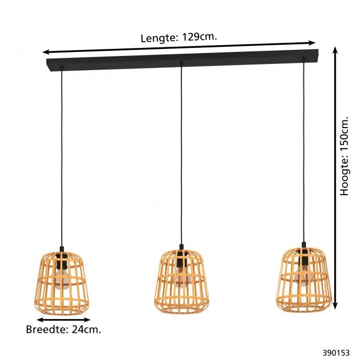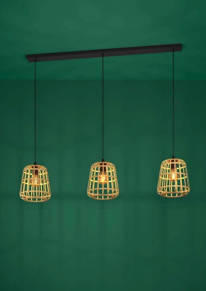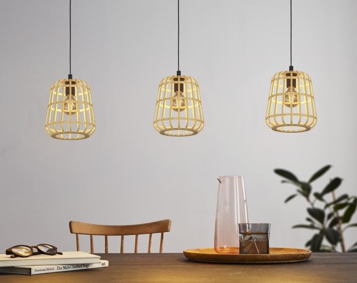 Een hanglamp met 3 lichtpunten uit de Montezuelo serie van Eglo met een natuurlijk tintje, de kooivormige lampenkappen zorgen ervoor dat het licht op een subtiele manier reflecteert rondom de omgeving van de lamp.