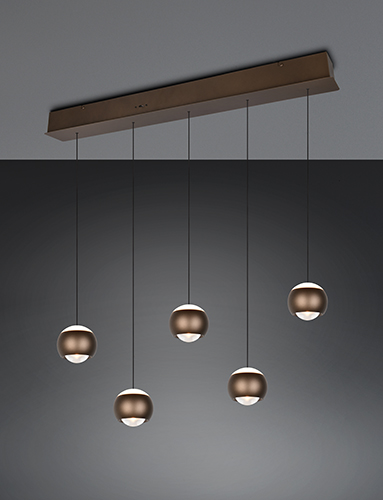 De TRIO Select hanglamp Orbit is een zeer stijlvolle hanglamp. De hanglamp bestaat uit 5 hangende lichtbollen. De lichtbollen hebben een witte kunststof bovenkant met daaronder een bol geheel uitgevoerd in de trendkleur platinum.