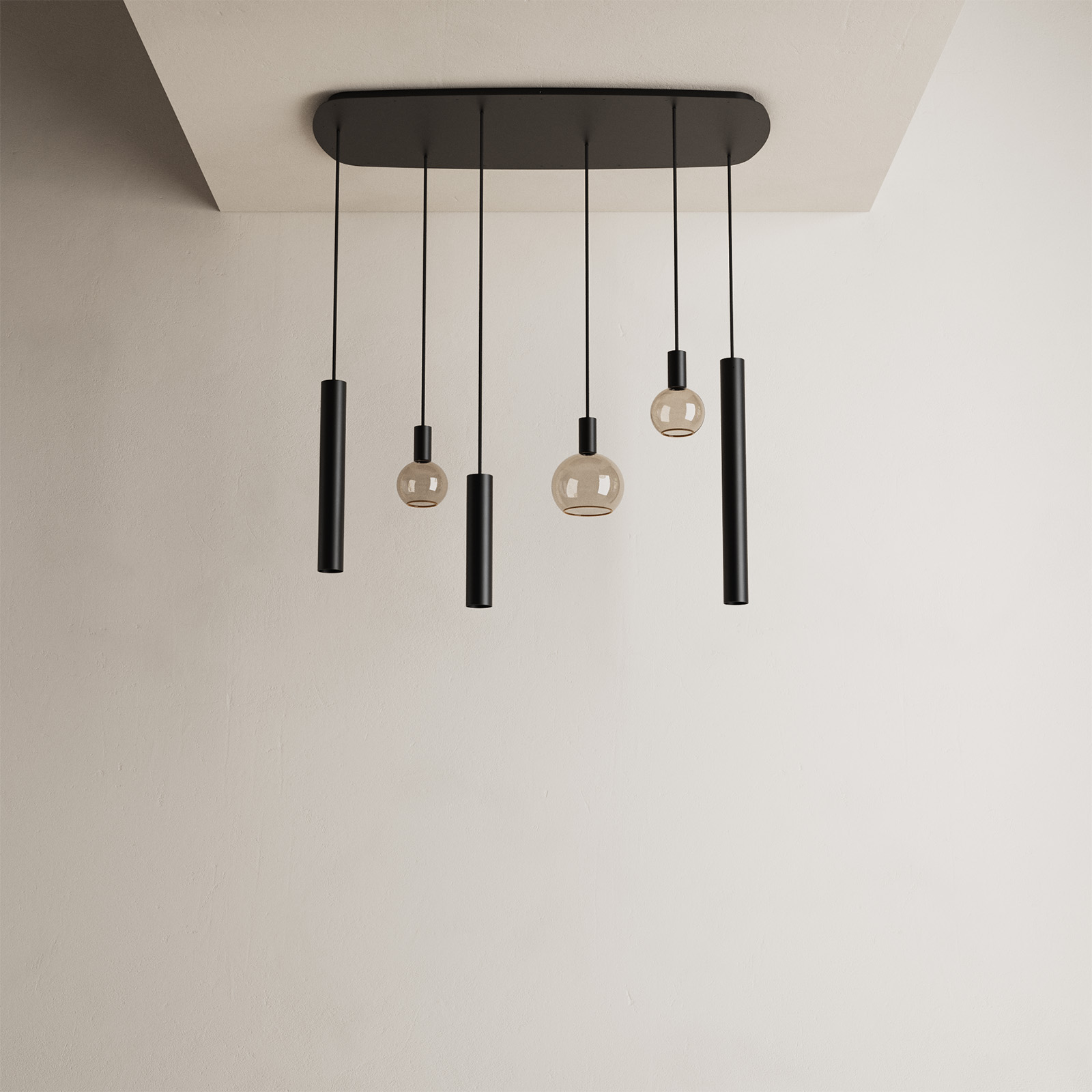 De Riva serie is één van de populairste modellen van ZTaHL by Dijkos. De hanglamp Riva Deens zwart is een echte eyecatcher, zeker met de gave Segula lichtbronnen. Deze opvallende serie heeft door de combinatie van verschillende fittingen (GU10 en E27) en verschillende hoogtes een speels effect. De hanglamp Riva Deens zwart heeft een rechthoekige ovalen plafondplaat van 110 x 50 cm. De lamp is ook verkrijgbaar op een plafondplaat van 145 x 55 cm of op een ovale plafondplaat van 140 cm. De pendels zijn ook leverbaar in een platinum kleur.