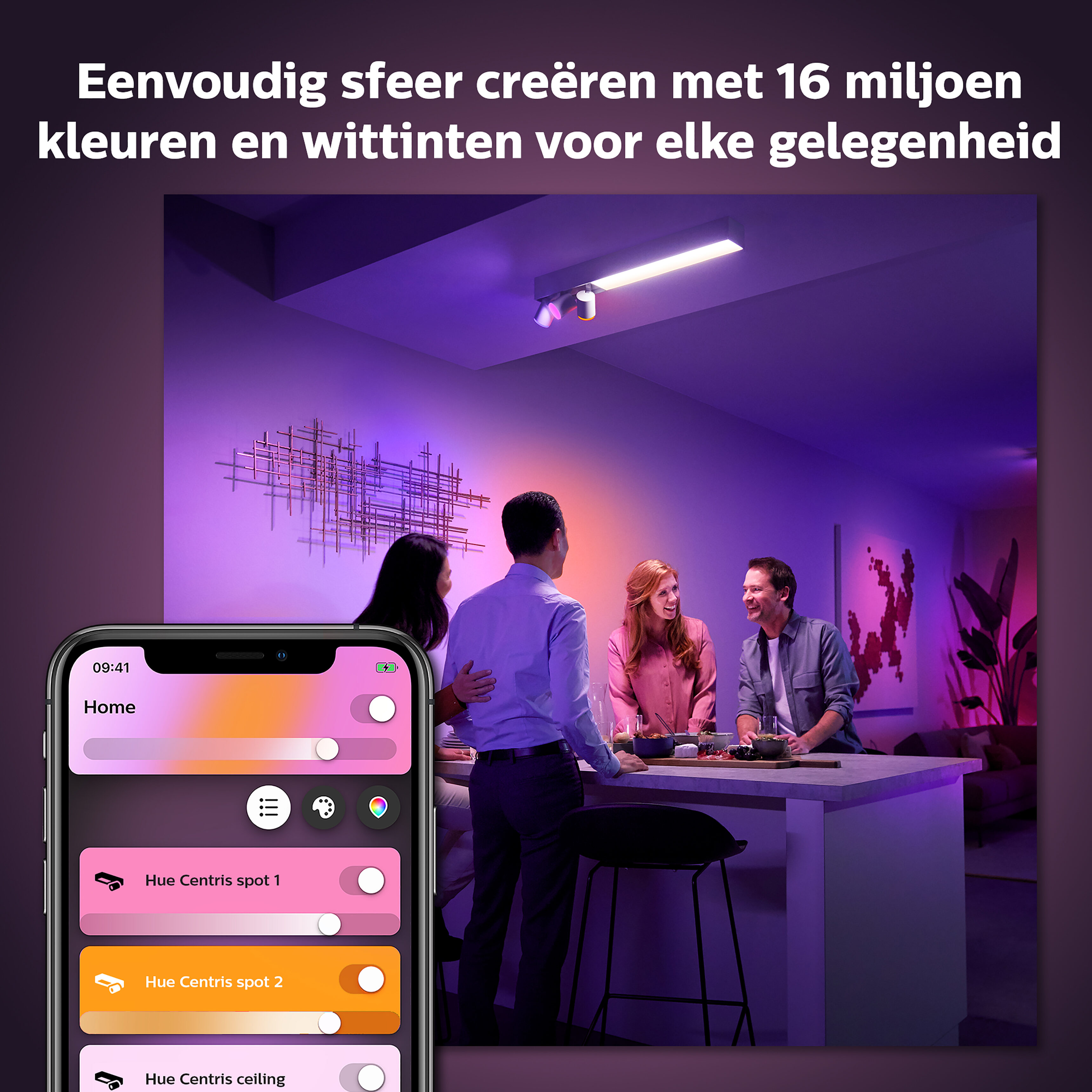Perfecte combinatie van een plafondlamp en spots. De Centris serie van Philips Hue kenmerkt zich door de plafondlamp gecombineerd met spots. Deze witte uitvoering bestaat uit 3 spots welke te kantelen en draaibaar zijn. Deze Hue Centris heeft vele mogelijkheden en is een verrijking in uw Hue collectie. De lampen zijn apart van elkaar in verschillende kleuren in te stellen. Hiermee kunt u functionele en accentverlichting combineren. Creëer sfeer met 16 miljoen kleuren en wittinten. Stel thema’s in of maak schema’s. Gemakkelijk te dimmen met de Hue app, een afstandsbediening of ook gemakkelijk aan te sluiten via Bluetooth of de Hue Bridge.