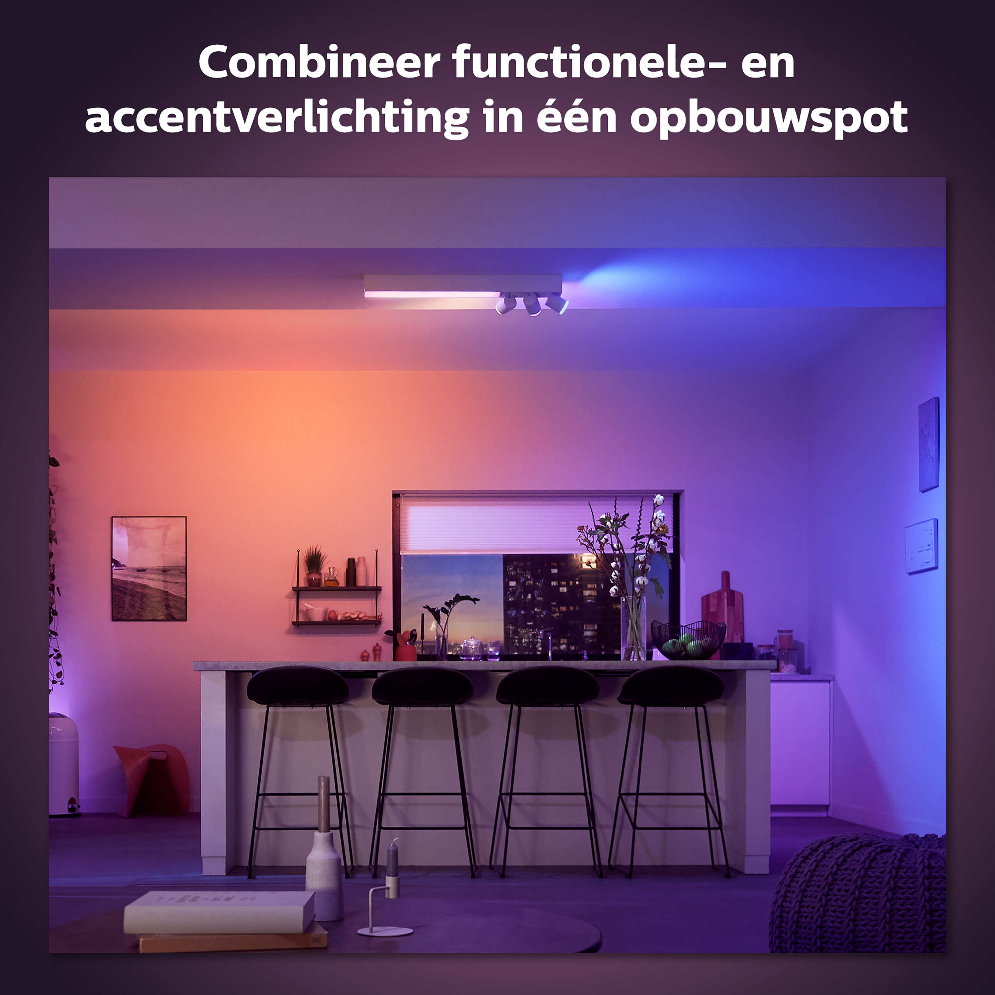 Perfecte combinatie van een plafondlamp en spots. De Centris serie van Philips Hue kenmerkt zich door de plafondlamp gecombineerd met spots. Deze witte uitvoering bestaat uit 3 spots welke te kantelen en draaibaar zijn. De lampen zijn apart van elkaar in verschillende kleuren in te stellen. Hiermee kunt u functionele en accentverlichting combineren.