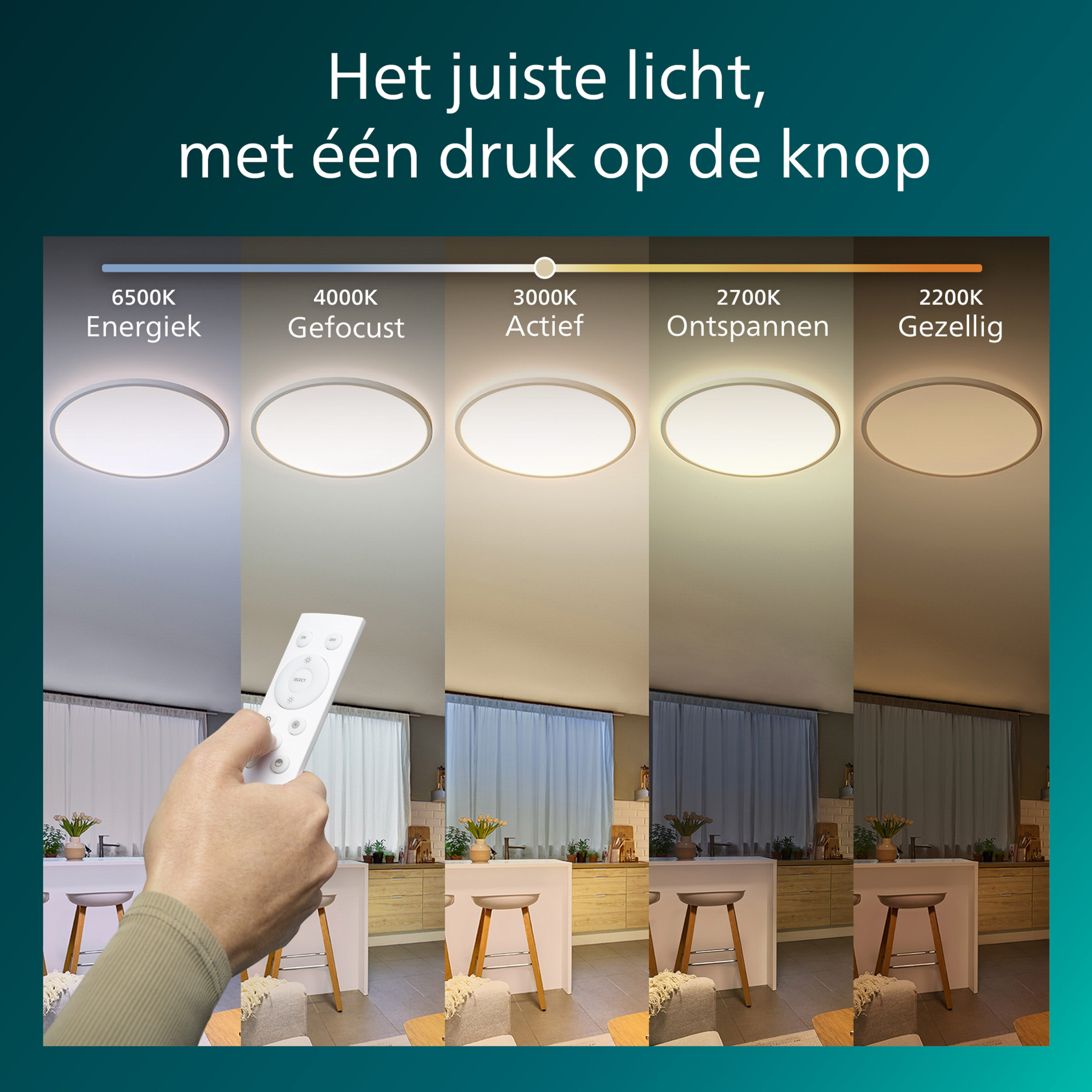 Wat deze lamp bijzonder maakt, is de bediening via de meegeleverde afstandsbediening, dimmen en aanpassen kan alleen op deze manier. Hiermee bepaal je de helderheid en de kleurtemperatuur, afgestemd op jouw situatie. Wil je ontspannen? Kies dan warmwit licht (2700K). Heb je focus nodig? Dan biedt koel wit licht (4000K) precies wat je zoekt. Dankzij de WarmGlow-technologie wordt het licht warmer naarmate je dimt, tot 2200K, voor een extra knusse sfeer. De speciale nachtmodus zorgt voor een zacht oriëntatielicht van slechts 1% helderheid, ideaal voor ’s nachts.