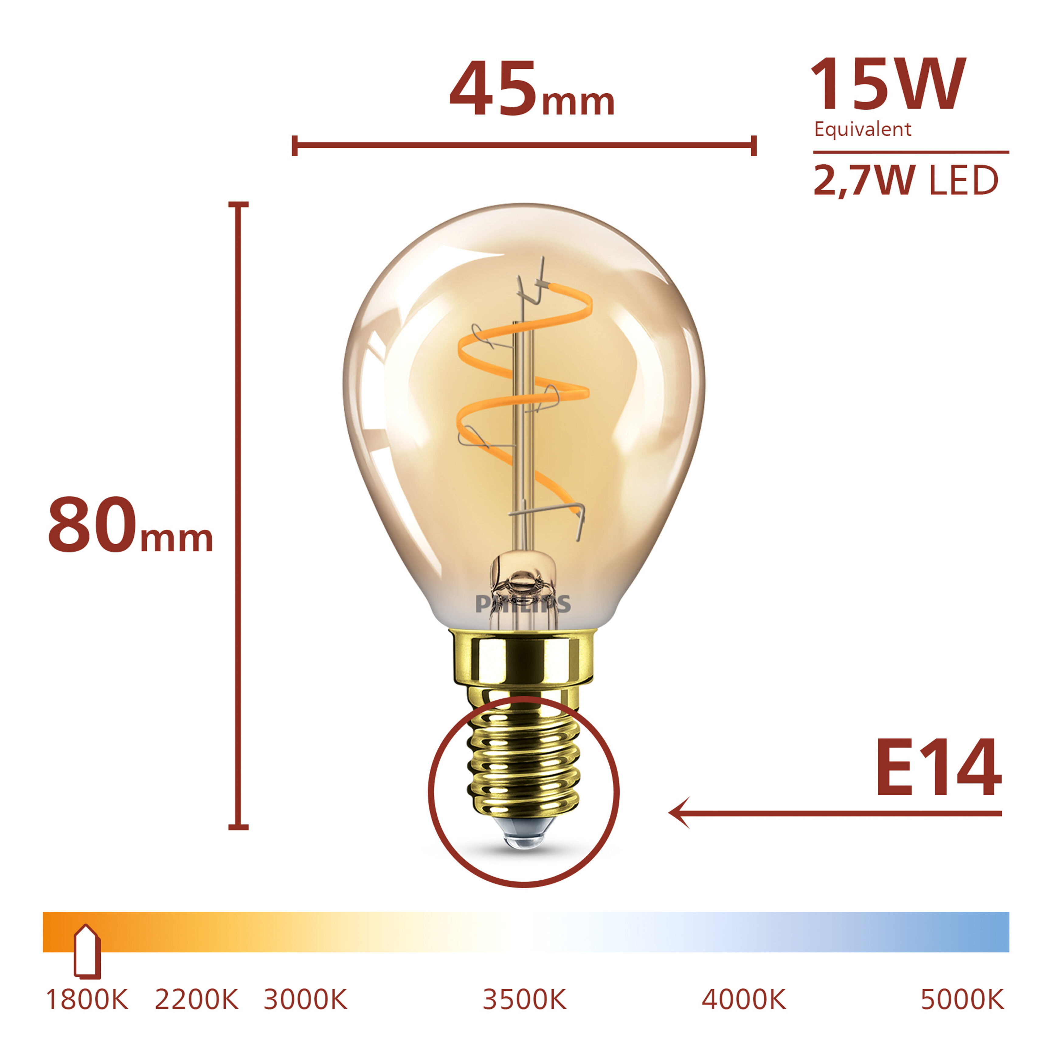 Deze E14 lichtbron heeft een wattage vermogen van 2,7 Watt (vergelijkbaar met een oude gloeilamp van 15 Watt), weergeeft een extra warm witte kleur van 1800 Kelvin en heeft een lichtopbrengst van 180 Lumen. De lichtbron heeft een diameter van 4,5 cm en een hoogte van 8 cm. Ook verkrijgbaar in een uitvoering met E27-fitting.