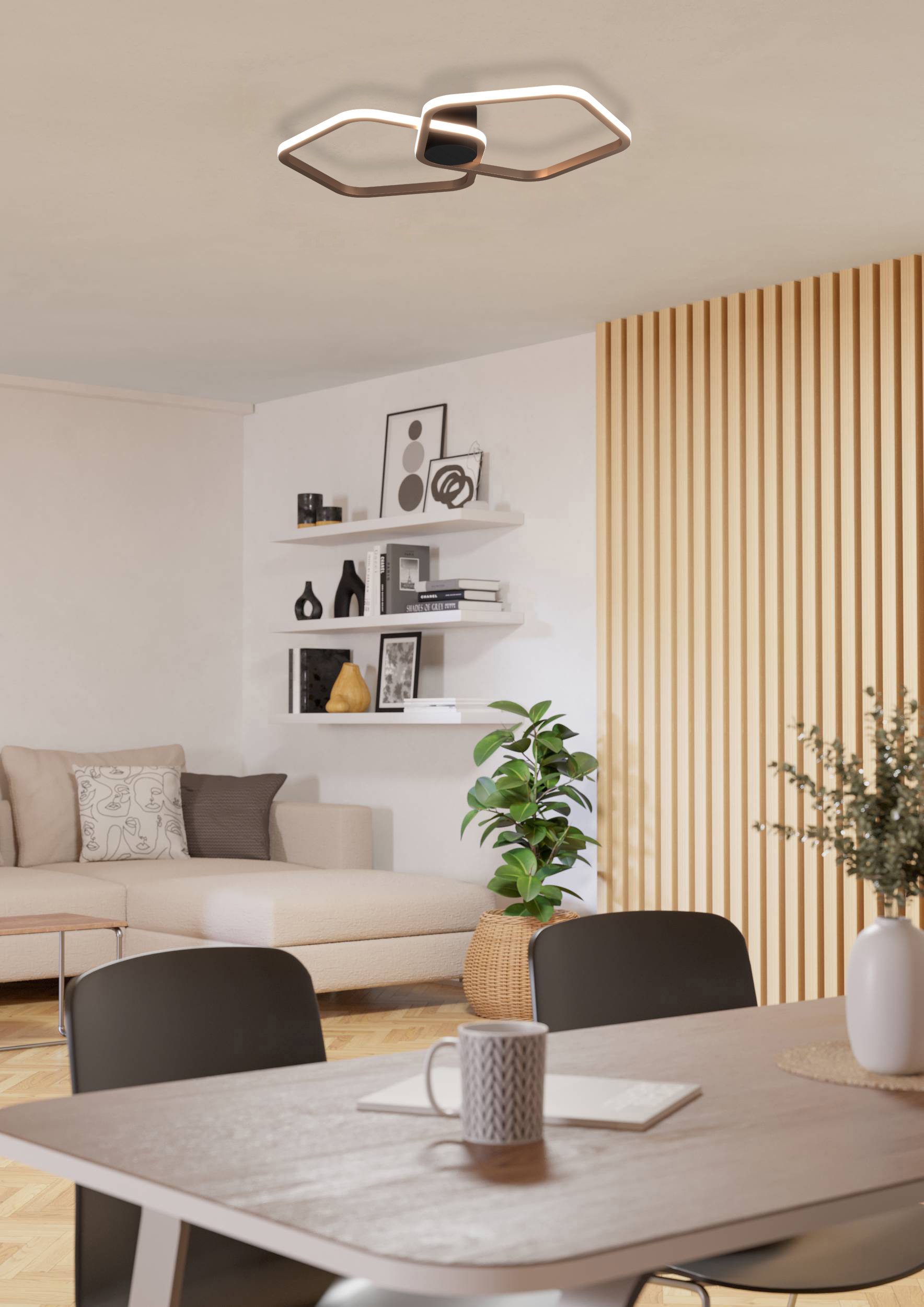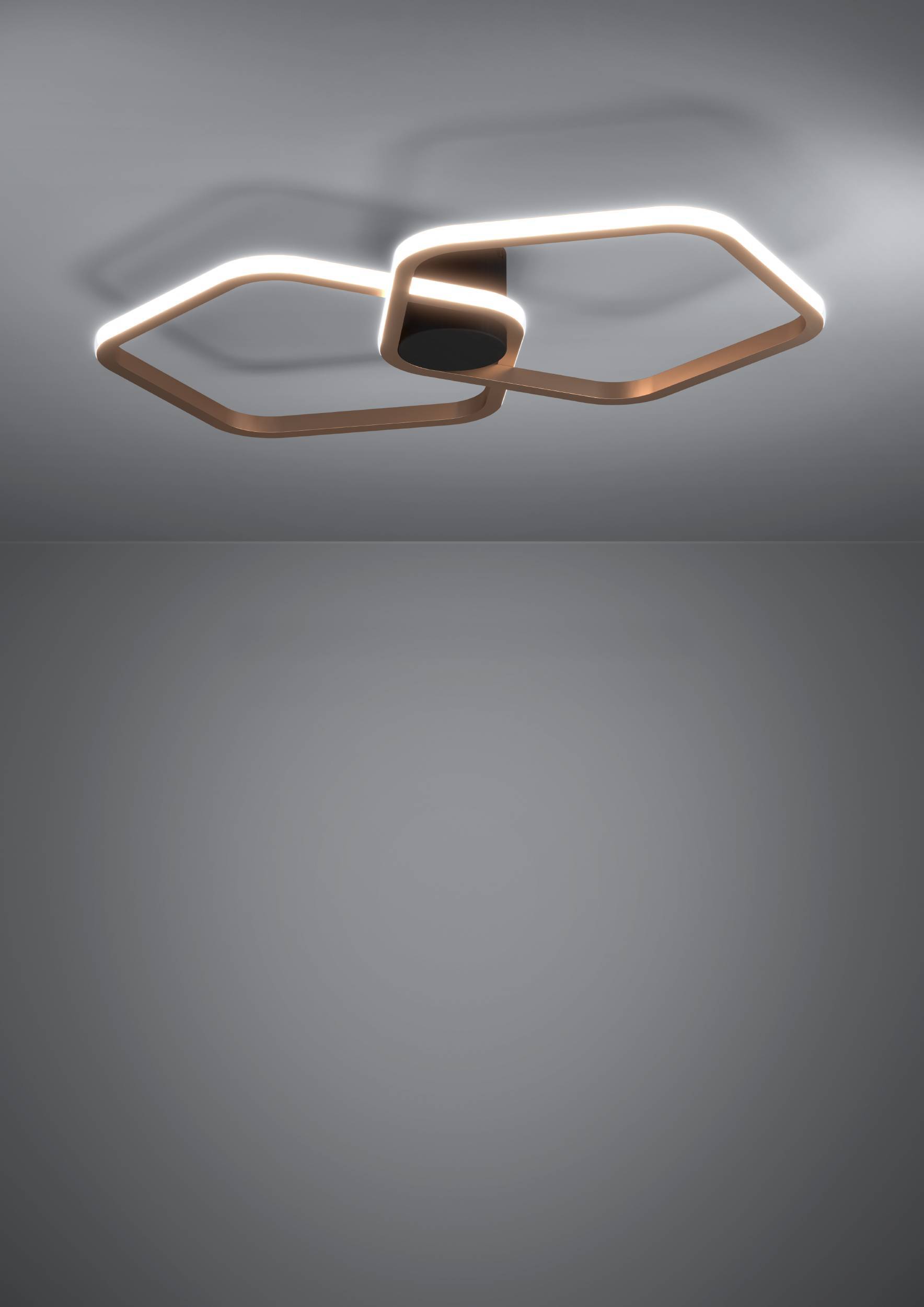 De Estrella plafondlamp van Eglo Stars of Light brengt architectonisch design en slimme lichtfuncties in harmonie. Twee organisch gevormde lichtframes van aluminium in een elegante bronzen look grijpen in elkaar en creëren door hun verspringende opstelling een dynamisch, driedimensionaal ogend totaalbeeld. De zwarte plafondkap zet een contrastrijk accent en verankert de lamp subtiel in de ruimte.