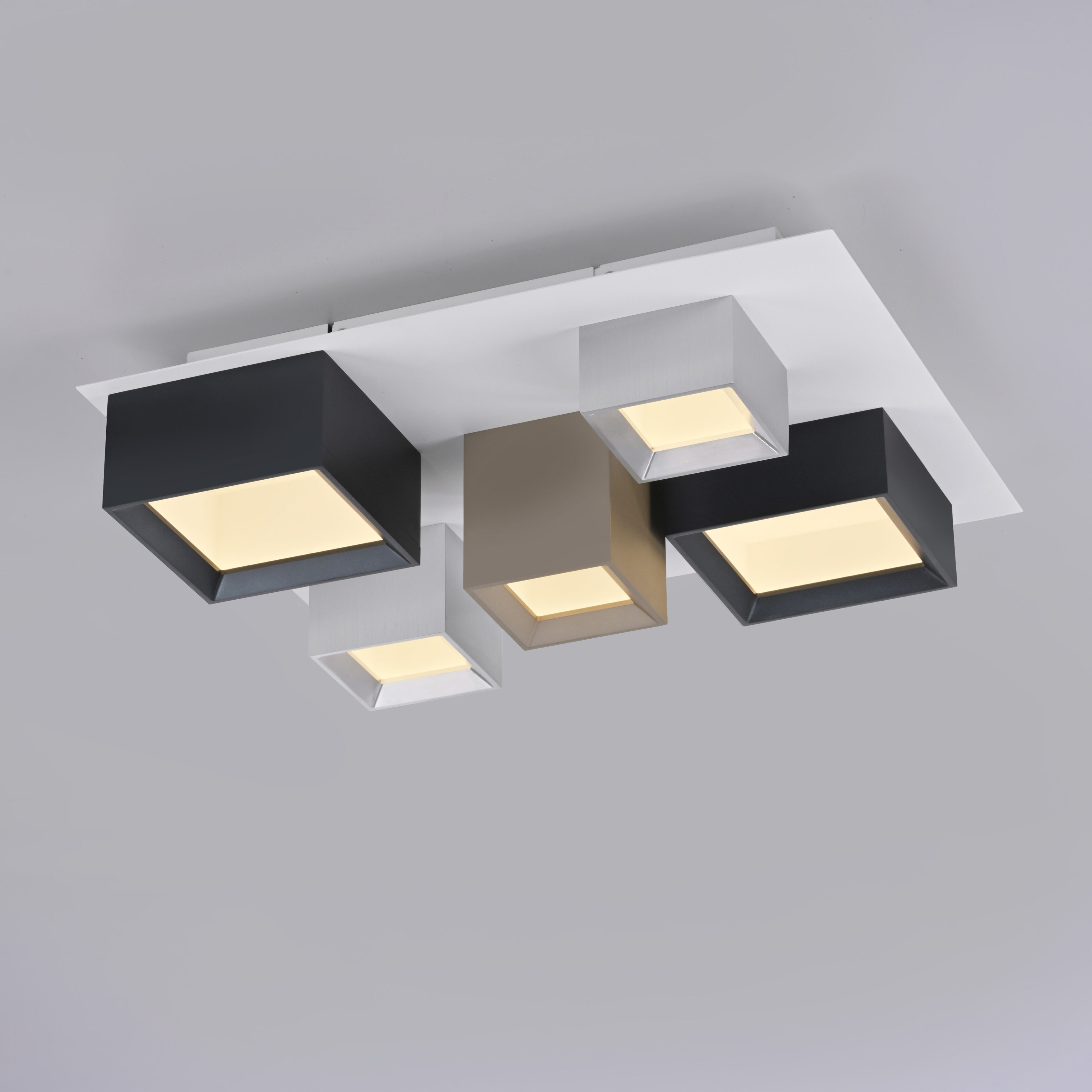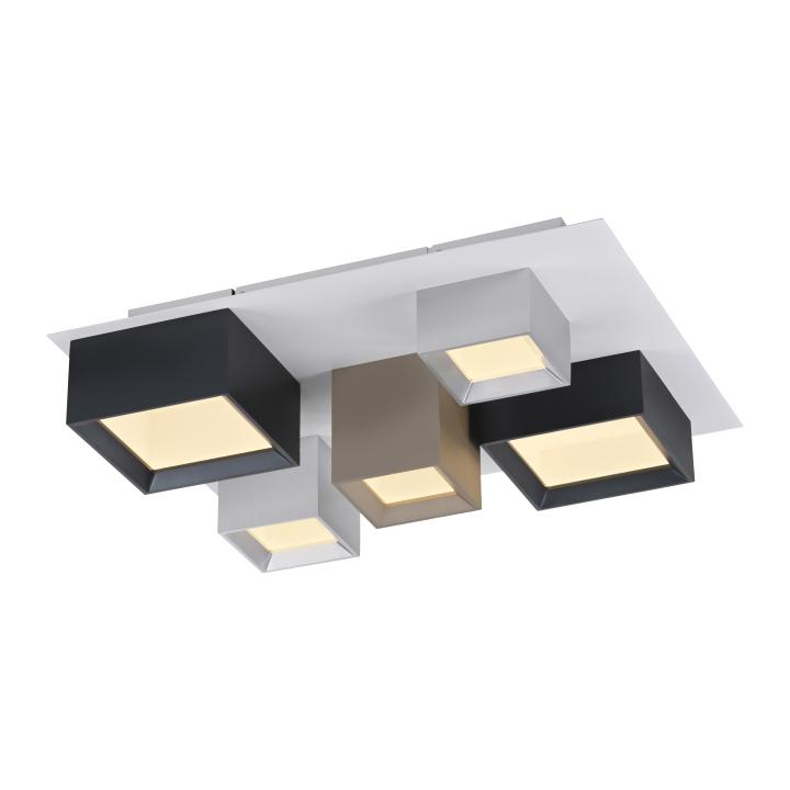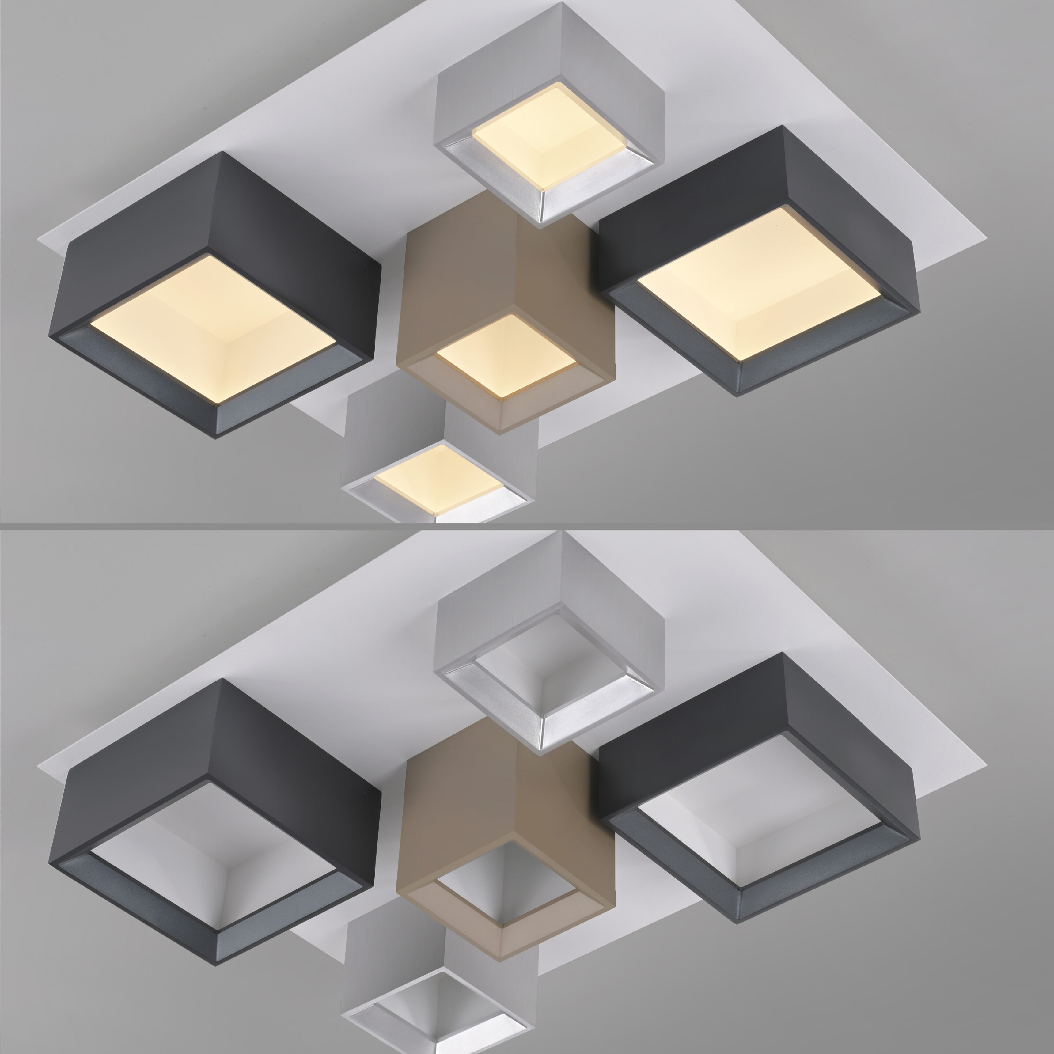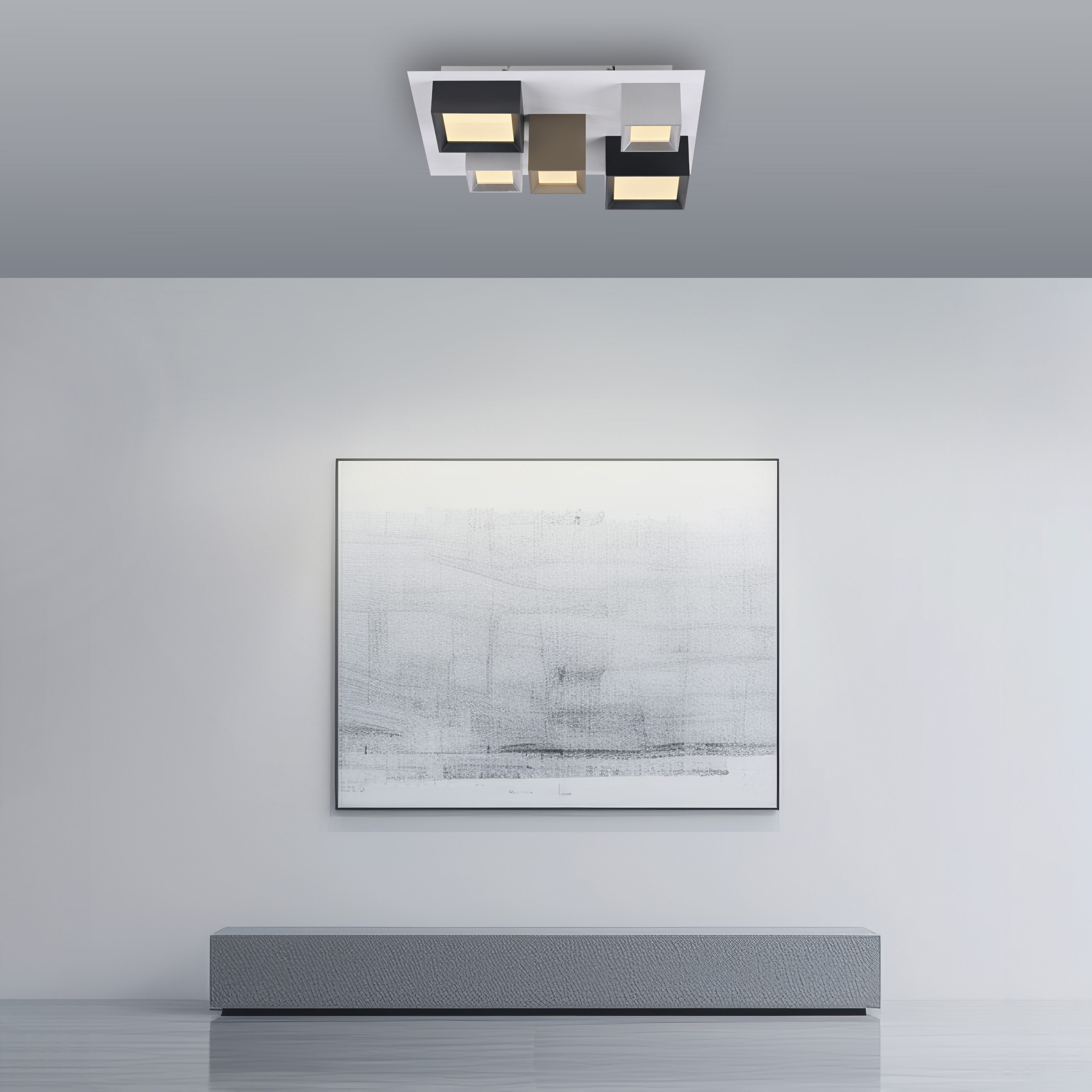 De kleinere Pure Manhattan LED plafondlamp is de perfecte keuze voor wie modern design wil combineren met slimme lichttechnologie, maar liever een compactere uitvoering zoekt. Met zijn kubistische lichtmodules in mat aluminium, diep zwart en warm brons ontstaat een architectonisch lijnenspel dat direct karakter geeft aan de ruimte. Deze lamp functioneert niet alleen als lichtbron, maar ook als designaccent dat moeiteloos past in moderne interieurs, van woonkamer en keuken tot slaapkamer of hal. Met een formaat van B 50 x D 40 x H 15 cm is dit model ideaal voor middelgrote ruimtes waar je wél impact wil maken, maar zonder een overweldigend armatuur.