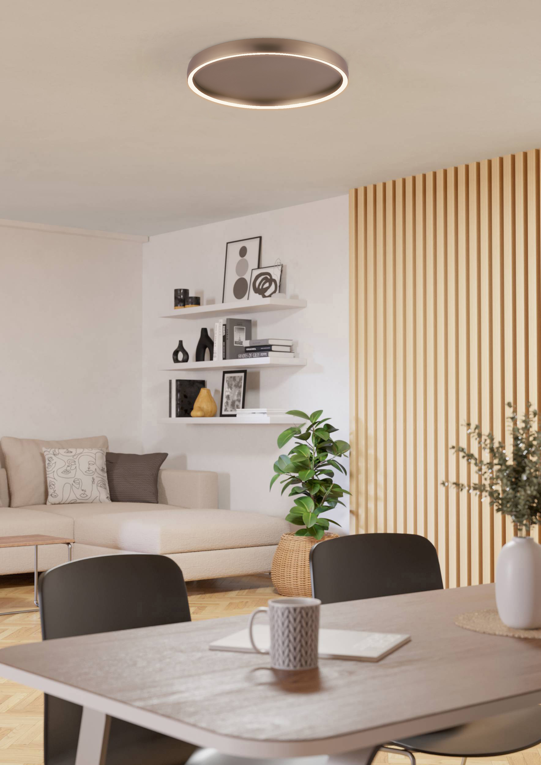 De Trabuco is voorzien van twee geïntegreerde LED-ringen: een krachtige 31 Watt lichtkring aan de onderzijde en een 10 Watt ring aan de bovenzijde. Samen creëren ze een aangenaam, veelzijdig lichtbeeld dat zich moeiteloos aanpast aan elke situatie. Dankzij de ruime instelbaarheid in lichtkleur – van sfeervol warmwit (2200K) tot helder daglicht (6500K) – heb je altijd de juiste verlichting bij de hand. De plafondlamp heeft een totaal lichtopbrengst van 4800 Lumen. De Trabuco hanglamp is niet geschikt voor een externe dimmer.