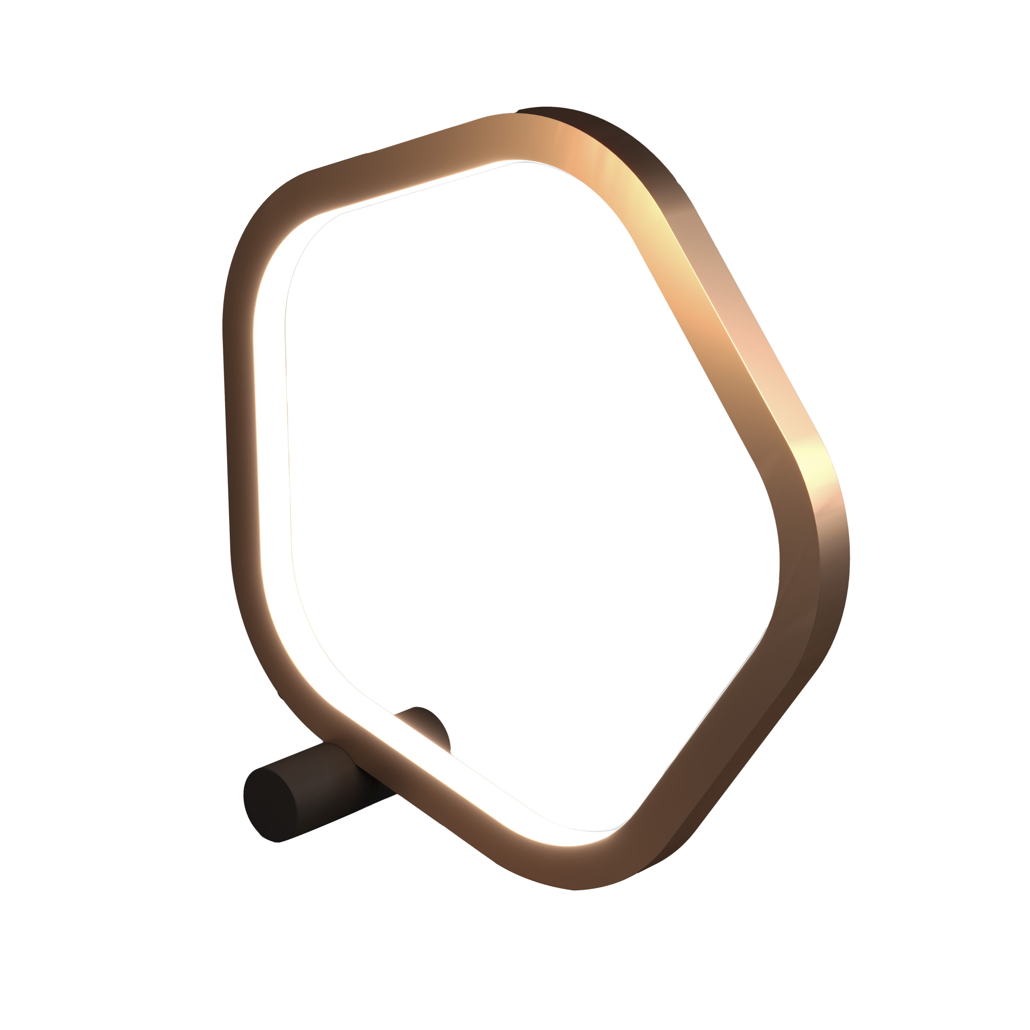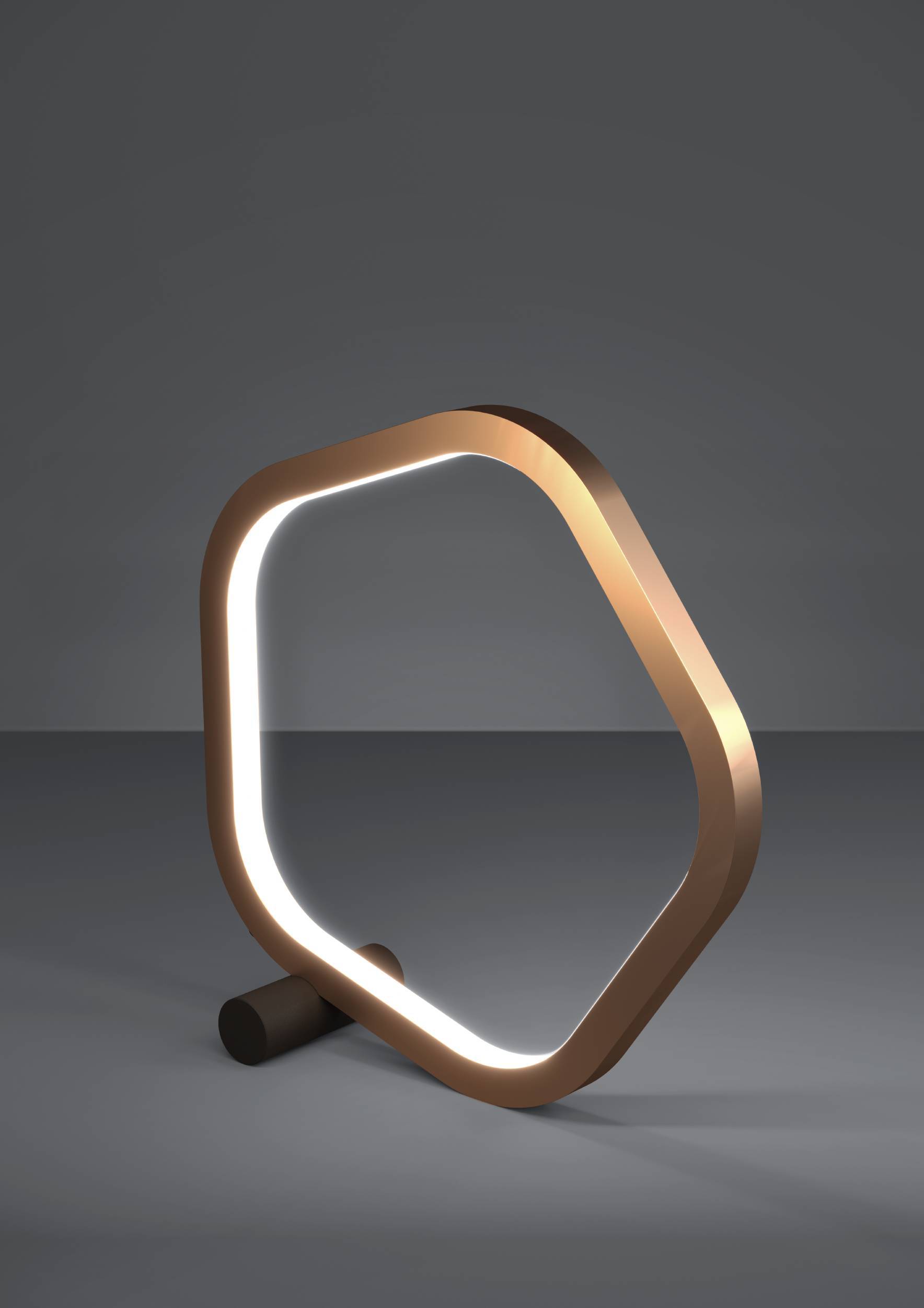 De Estrella tafellamp overtuigt door haar uitzonderlijke design en doordachte functionaliteit. Het vijfhoekige verlichtingsframe van aluminium in een elegante bronzen look staat op een zwarte, cilindrische voet en doet denken aan een gestileerd lichtobject met een grafisch karakter.