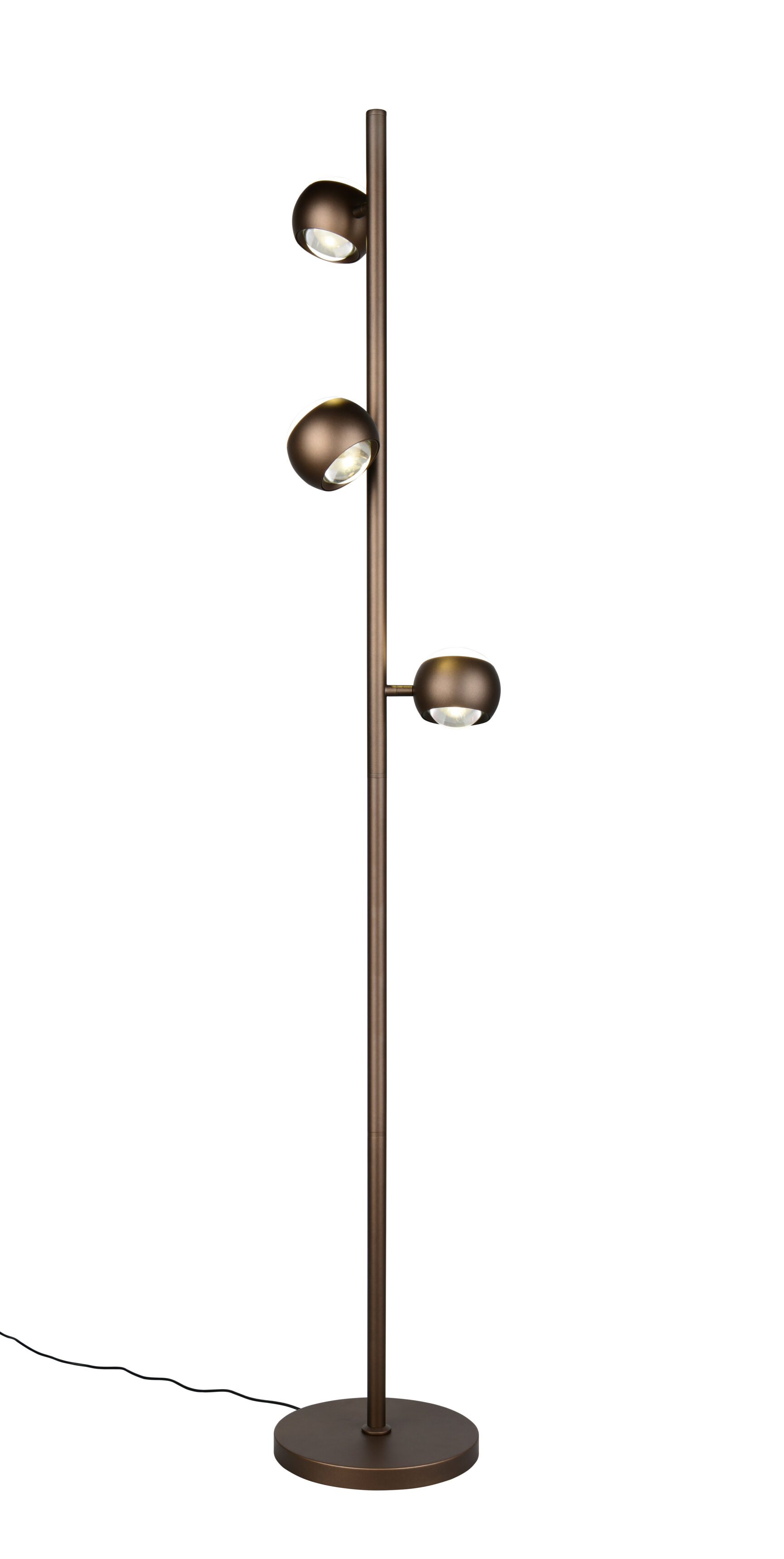 De Orbit vloerlamp heeft een rond voetplaat van 23 cm en een hoogte van 150 cm. De drie lichtbollen hebben elk een diameter van 10 cm en het meegeleverde snoerschakelaar is 180 cm lang.